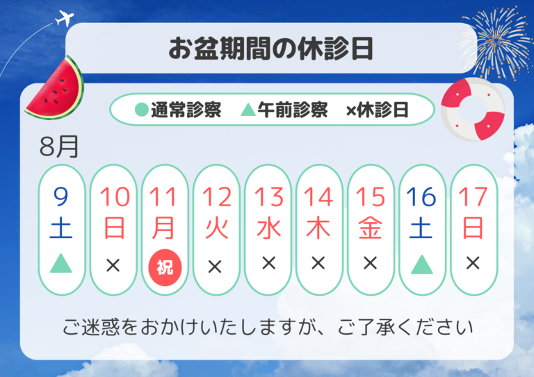 夏期休暇中、すべての診療や検査、お薬の処方はご対応ができません。